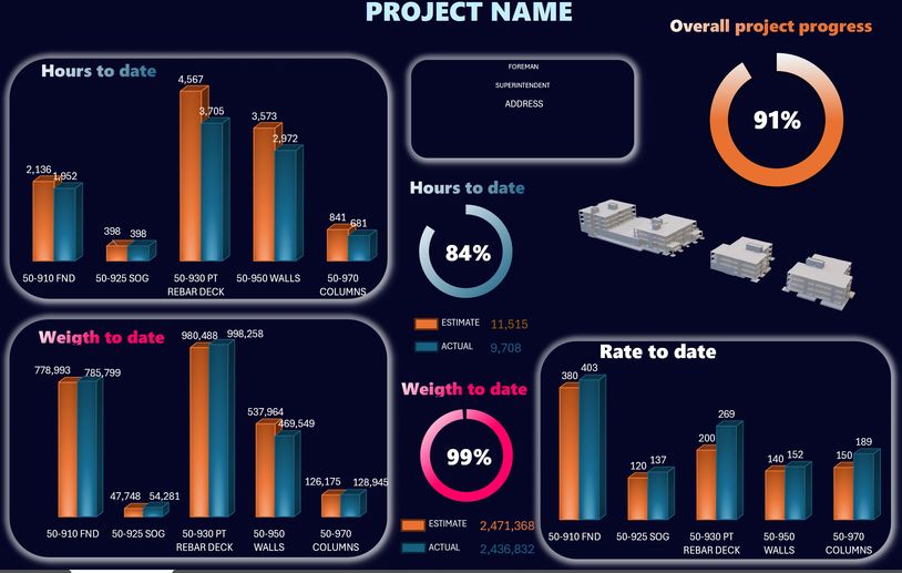We’ve developed powerful real-time dashboards for every project, highlighting the key metrics that drive success. These dashboards track budgeted versus actual labor hours and weights for each concrete pour. After every pour, performance is visualized through intuitive graphs and charts, providing instant feedback on productivity. One of the most valuable features is that the dashboard also displays the actual labor rates per hour during installation—a critical metric for field operations. This insight enables our teams to adjust in real time, maintain efficiency, and continuously improve project execution.